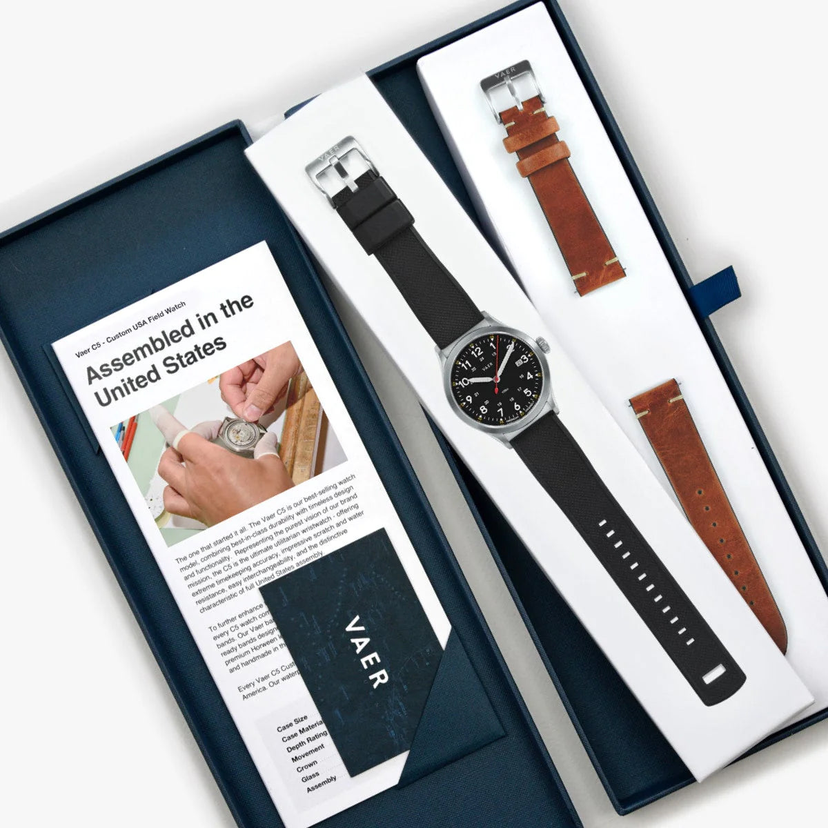 SUMMARY: This is the solar-powered version of our top-selling C5 Field Black. Solar provides the best of both worlds - perpetual timekeeping with incredible accuracy. Six hours of sunlight will provide six months of power reserve, and the watch can run off any light source (even candlelight). The C5 Field Black is a military-inspired 10ATM watch, that stands out in the Vaer line-up thanks to its classic field watch design and the distinction as being longest selling product (first launched in 2018). As a C5 model, this watch is part of our all-time bestselling collection, distinguished by its ocean-ready functionality, low-profile case design, strong lume, ultra-accurate solar quartz movement, and full USA assembly.